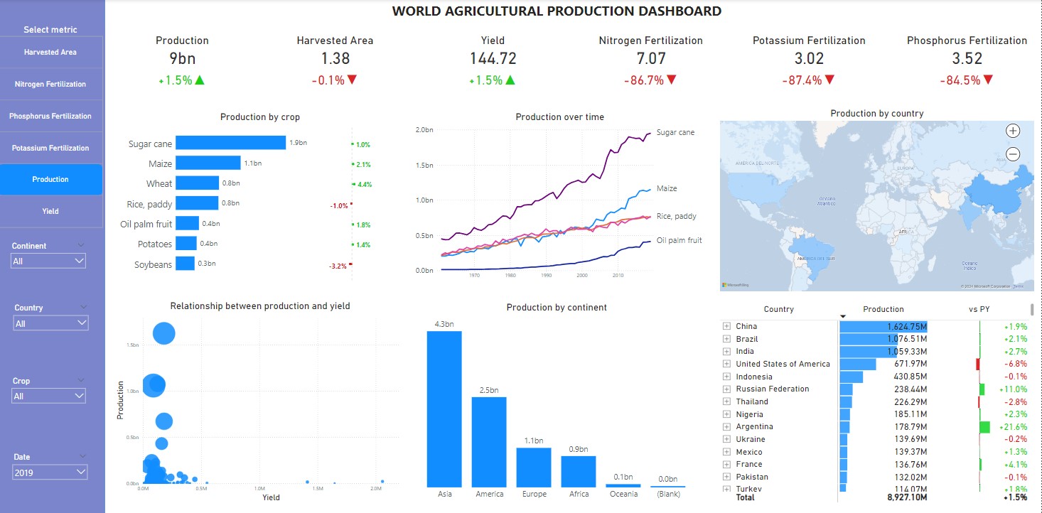 Analyzed world agricultural production by consolidating several data sources into a SQL database, conducting insightful queries and developing an interactive Power BI dashboard