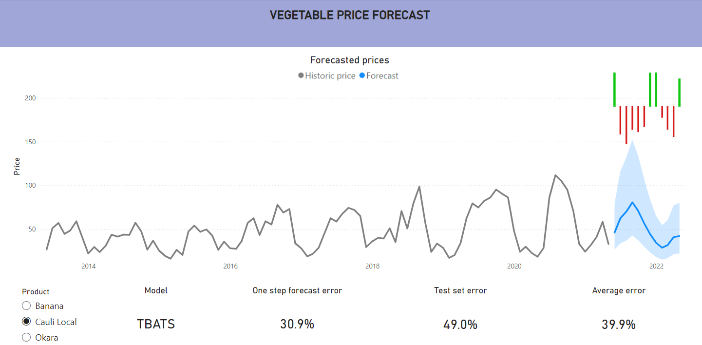 Automated the forecasting process of vegetable prices using different time series models in R, displaying the forecasts on an interactive Power BI dashboard